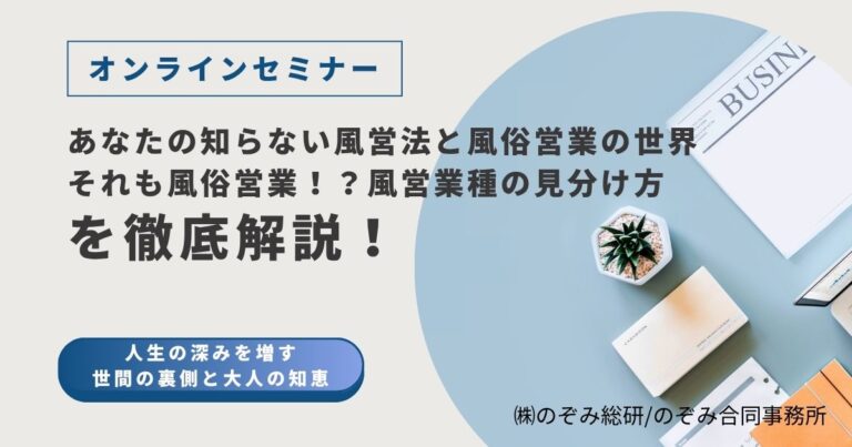 セミナーテーマ 概要 よく見かけるけれど不思議な店。風俗店なのかなんなのかわからない怪しい店。 街の風景に溶け込んでいてあまり気にしていないけれど、実は風営法が関係していたりします。 風営法の規制を受けるということは警察 … 続きを読む 風営法をもっと知ろう!あなたの知らない風営法と風俗営業の世界/様々な風営業種の見分け方と以外な法的問題点を専門家が解説
