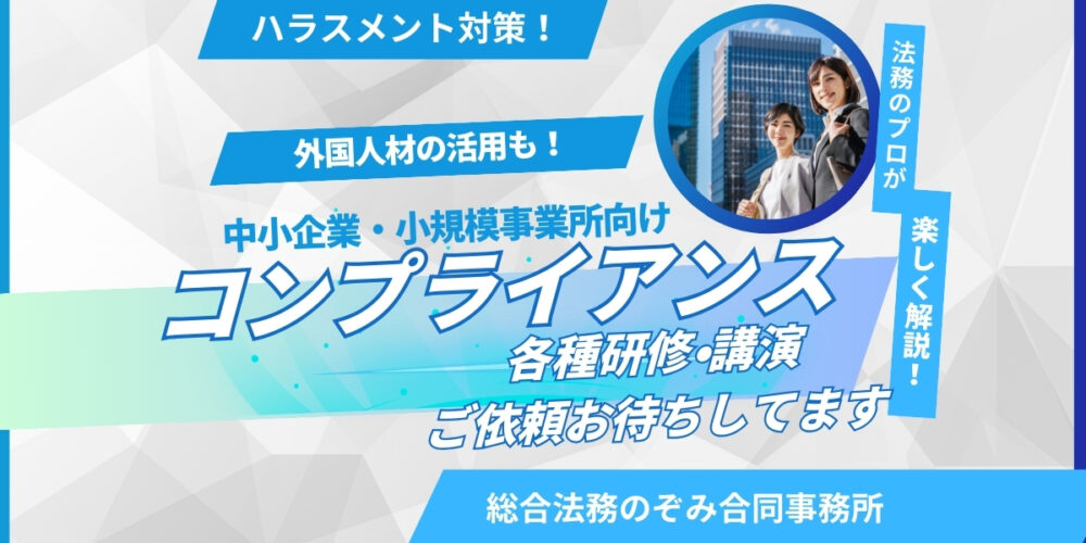 全国の中小企業・小規模事業のニーズに合わせた各種コンプライアンス研修を中小企業の法務・コンプライアンス・外国人材活用を専門とする専門家が明るく楽しい雰囲気でオンラインで行います。